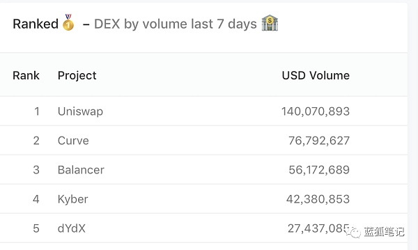 Balancer是近期繼Compound之后,第二個推出流動性挖礦的項目。它的流動性從6月5日的不到2000萬美元,增長到7月5日的1.4億美元,在一個月時間內增長了大約7倍,成為當前流動性最高的DEX項目,同時,其交易量也在快速增長,從其最近一周的交易量來看,已經躋身前三,僅次于Uniswap和Curve,且還有繼續攀升的趨勢。關于Balancer的更多文章《Balancer接棒Compound?》。