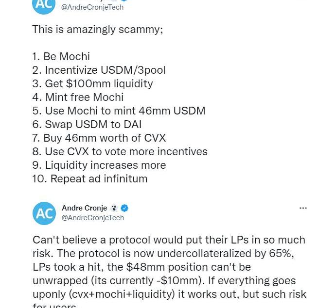 XRP/HKD+1.66%周四,Curve緊急事件處理委員會的核心成員Charlie_eth發布了一個帖子,CVX價格的異常波動引起了該DAO的注意,最終發現是由USDM穩定幣協議Mochiprotocol發起的「治理攻擊」。