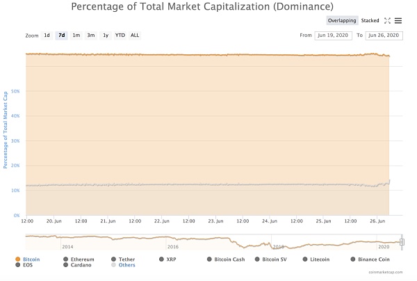 截止報告發布時間(2020 年 6 月 26 日),本周五全球數字貨幣資產總市值為 2,614.07 億美元,同比下降 18.34 億美元,下降 0.70%。24 小時市場成交額為 729.02 億美元,同比上漲 79.58 億美元,上漲 12.25%。本周市值同比無明顯變化,24小時成交額有一定程度增長。市場短期而言,運行到高位就會快速回調,回調一定程度后進入一個平緩期,投資者在交易過程中相對謹慎。