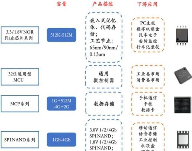 公司主要業務為閃存芯片及其衍生產品、微控制器產品和傳感器模塊的研發、技術支持和銷售,其中傳感器業務來自于2019年公司收購上海思立微電子科技有限公司。公司產品為NORFlash、NANDFlash及MCU,廣泛應用于手持移動終端、消費類電子產品、個人電腦及周邊、網絡、電信設備、醫療設備、辦公設備、汽車電子及工業控制設備等各個領域。