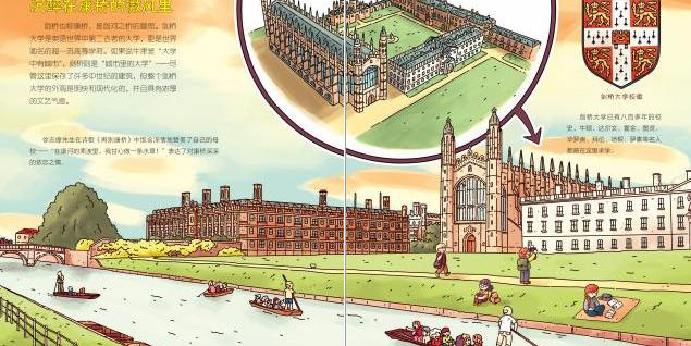 有的圖片能給孩子提供另一個視角,鍛煉他們的空間思維能力。比如介紹英國的劍橋大學,跨頁展現的是從地面的觀察角度,而圓圈標注的是從空中觀察的角度,更立體,更有輪廓。