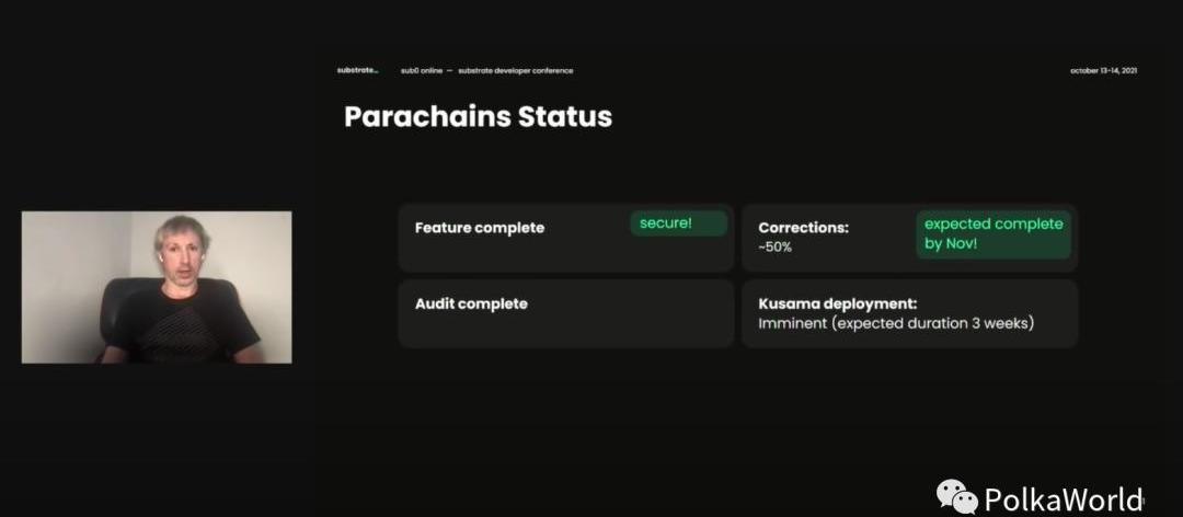 目前平行鏈代碼的功能已經完成,也就是所有的Polkadot規范中的安全機制都已實現、測試并審計過了。沒錯,審計已經完成了,對于審計中提出的修改意見,應該能在11月前完成一半。并且我們確實期待很快完成這些功能的初始部署,把安全性代碼補充到Kusama上。在真正把代碼投入生產環境前,我們會留出三周,但是我們認為代碼不會有什么重大的問題了。所以說,根據這個就可以推算出Polkadot平行鏈上線的時間表。