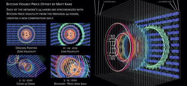 NFT藝術品「RightPlace-RightTime」來自藝術家MattKane,這是一件以比特幣為主題的動態作品,作者在其中植入了BTC喂價算法,該NFT會根據每隔12小時更新一次的BTC價格而變化,也就是說作品的圖案會基于比特幣價格波動性而變化。此外,每一次BTC價格突破關鍵節點,該NFT會自動鑄造新的NFT并出售,限量為210枚,購買者有資格申領一個對應的NFT印刷版實物。可以說,這些作品是以NFT卡牌的方式記錄BTC價格歷史,具有一定收藏價值。