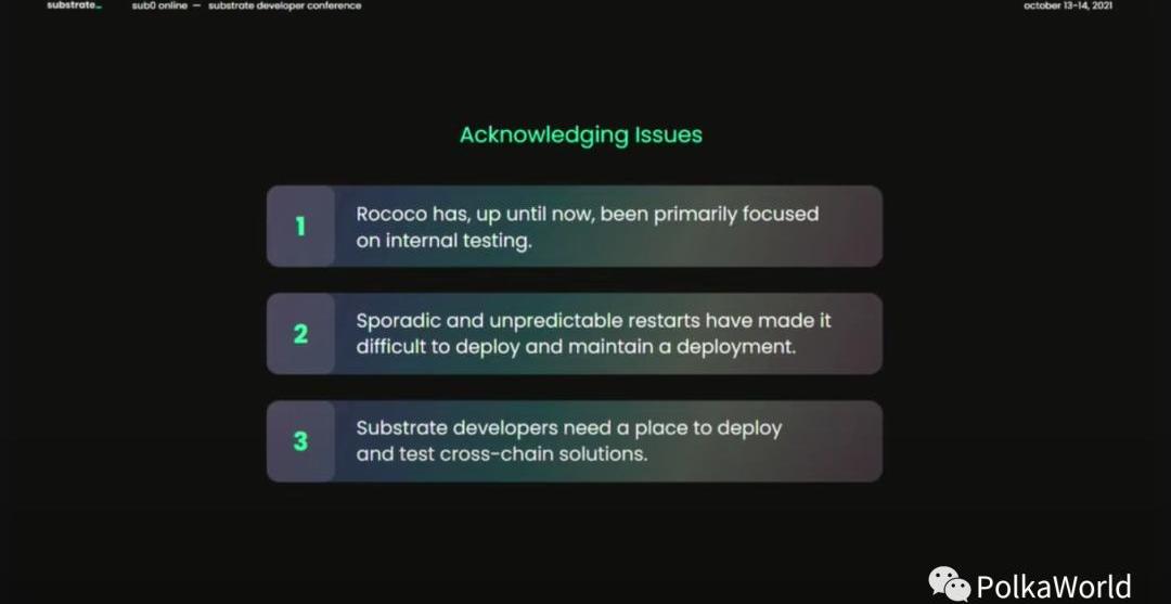 之前我提到了Parity在運行所有的Rococo節點,它的作用主要集中在內部測試上,我們會運行前沿代碼,快速修改,部署對抗性節點之類的。但這確實意味著當我們在開發過程中發現了錯誤,我們偶爾會破壞這條鏈,這使得對于想在上面部署自己的平行鏈的團隊來說,這條鏈變成了一個非常困難的部署環境。Substrate開發者需要有一個地方來部署和測試跨鏈解決方案。隨著目前版本的XCM更加穩定,大家已經可以真正使用那些跨鏈創新了,那么一個測試環境就變得非常重要。