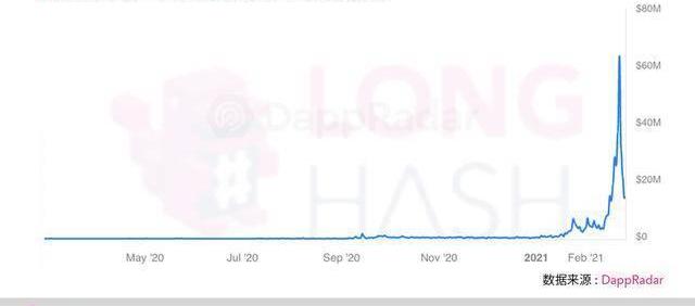 相比區塊鏈DeFi應用近百萬美元融資的規模,NFT區塊鏈生態的融資金額動輒千萬美元顯然更加受資本青睞,據DappRadar的數據顯示,NFT市場成交量在2021年2月22日單日成交量創6400萬美元,而1年前僅3.7萬美元,市場規模年增長過千倍。