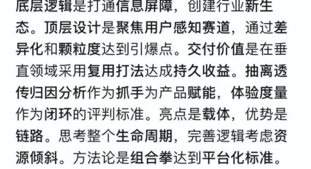 張一鳴在字節跳動9周年年會上念了一段他從公司一些人的文檔里摘抄的報告,以此來諷刺「互聯網黑話」,以下是摘抄的原文內容: