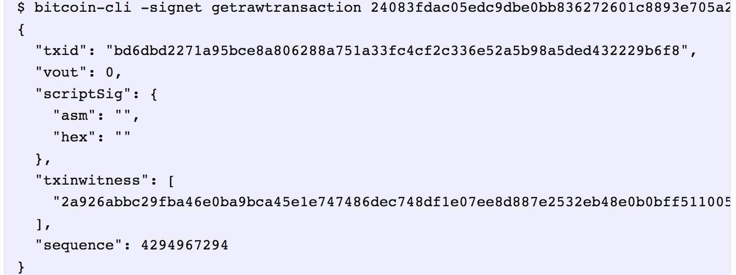 對于這筆花費,我們可以查看其中一個輸入,并看到它的witness只包含一個64字節的簽名。如果這是P2WPKH支出或任何其他類型的舊比特幣支出,那么所需要的witness會更大。
