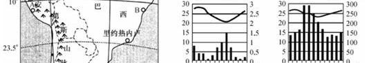如圖示意南美洲局部和沿海A、B兩城市的氣候狀況。據此完成15~16題。
