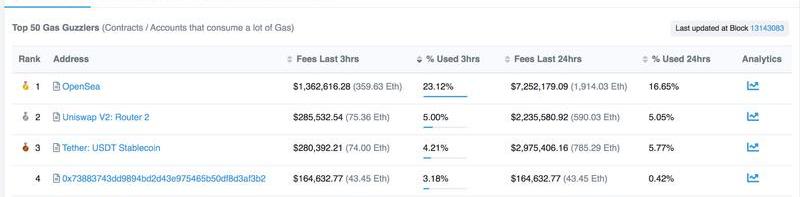 OpenSea處于增長的最前沿,近98%的NFT銷售都是通過該平臺完成的。OpenSea似乎要承擔整個以太坊區塊鏈費用的很大一部分。