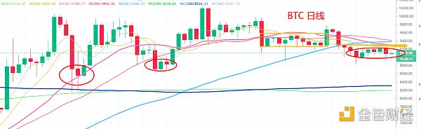 BTC 日線級別觀察,K 線群體小陰小陽,談不上有效的買賣信號,實操上等待震幅放大的過程,大陰線或者大陽線都是操作機會。短期壓力位在 9250 附近, 短期支撐位在 8950 附近。