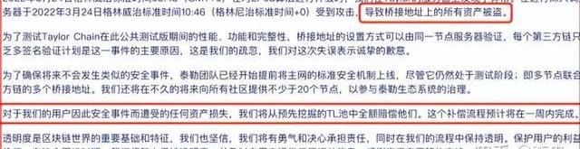 2022年的3月24日,泰勒公鏈騙局終于崩盤了,據官方發布的公告顯示,由于黑客攻擊,項目方在努力了半天的時間,終于還是不能阻擋黑客,導致被盜資產近千萬。