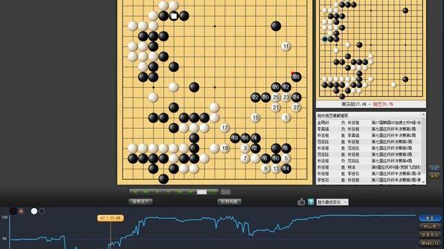 等到白棋不得不后手侵消右上黑模樣時,金明訓主動權盡失,只得亦步亦趨,步步驚心逃孤。這種局面對于老到的樸廷桓而言簡直沒有任何懸念,他厚實運轉,穩妥妥地將優勢導向終局,即使勝率略有反復,但黑棋優勢局面卻不曾改變。至269手,金明訓中盤認輸。