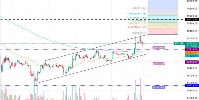 比特幣價格目前處于從11月22日開始的短期上升趨勢中。在12月的前十天,比特幣價格受到50天指數移動平均線的支撐和200天均線的阻力。然而,在12月13日,價格突破了兩條均線并飆升。兩條移動平均線目前交匯于17.327美元,這是比特幣價格的關鍵支撐位。如果50EMA收于200EMA之上,它也將預示著該資產的看漲黃金交叉延續模式。