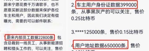 在網上流傳的一份泄露數據信息圖顯示,蔚來此次泄露的信息主要包括2.28萬條內部員工數據,售價0.15比特幣;39.9萬條車主用戶身份證數據,售價0.25比特幣;以及65萬條用戶地址數據,售價0.15比特幣。