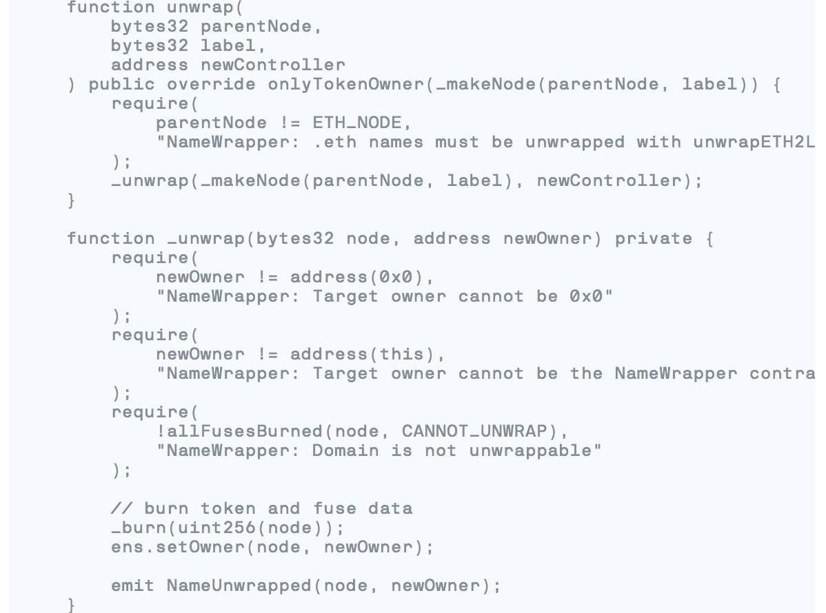 下面就是這個wrap函數,它相當簡單。首先,我們調用_wrap,它執行一些邏輯并返回哈希域名。然后,我們確保交易發送方確實是ENS域名的所有者,然后再接管該域名。請注意,如果發送方不擁有底層的ENS域名,則整個交易應還原,撤銷在_wrap中所做的任何更改。