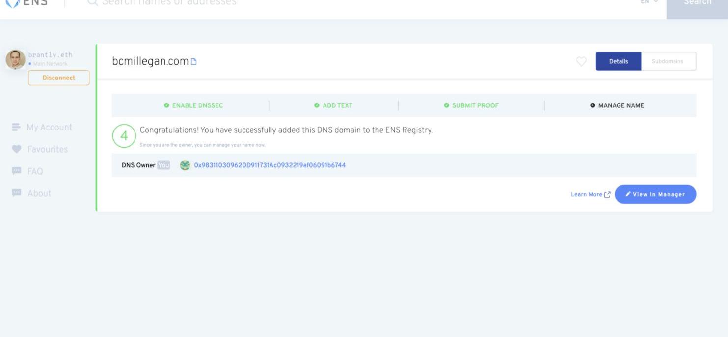 返回ENS?Manager應用程序頁面,刷新頁面以檢查是否已啟用DNSSEC并且你的TXT記錄是否存在。即使你在DNS端正確設置所有內容,也可能需要一些時間,您的DNS更新才會生效。當你的DNS設置生效后,頁面將是這樣的: