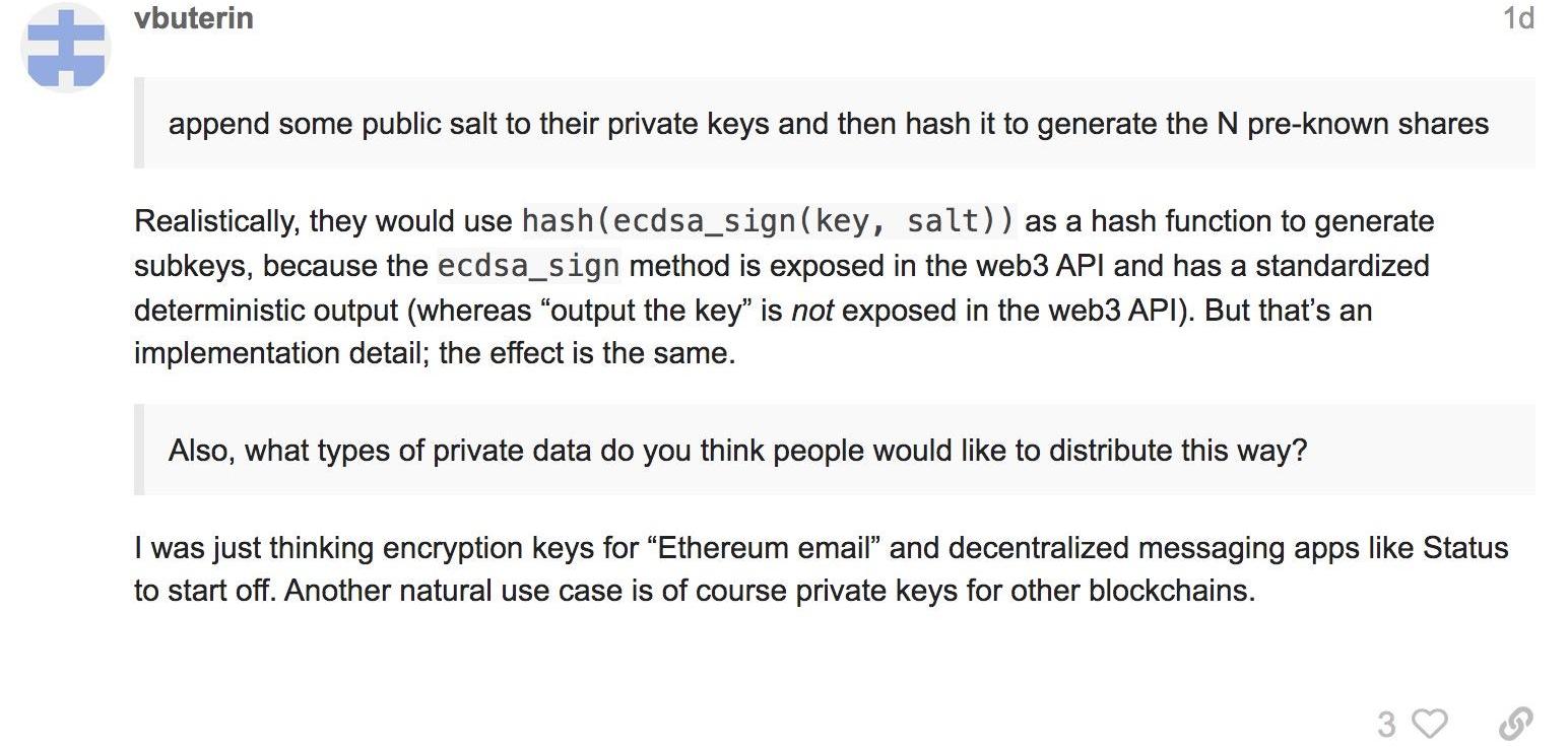 “這很有趣!我猜在社交恢復設計中,N個參與者會給他們的私鑰附加一些公共鹽,然后將其哈希生成N個預先知道的密鑰分享?否則他們將不愿意泄露自己的密鑰分享,以讓N?M個附加密鑰分享被計算,并且他們還必須透露M個密鑰才能恢復秘密。此外,你認為人們會用這種方式來分發哪些類型的私人數據呢?”而Vitalik則回復稱: