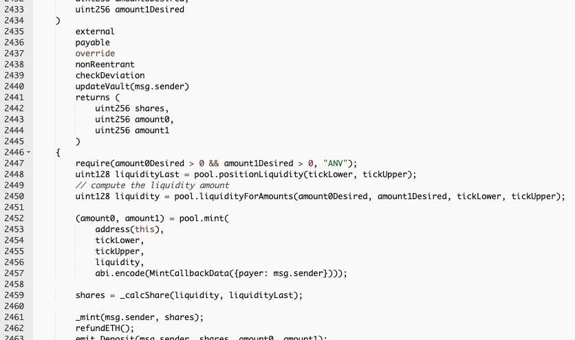 隨后攻擊者調用SorbettoFragola合約的deposit函數存入提供流動性對應的兩種代幣(這里以攻擊者首次存入的WETH與USDT代幣為例),其會先通過checkDeviation與updateVault修飾器分別檢查價格與更新獎勵。價格檢查主要是針對價格是否出現大波動被操控等情況,這里不做展開。而獎勵更新就與本次攻擊密切相關了,我們切入分析: