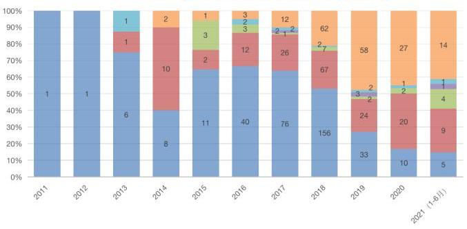 數據顯示,目前我國區塊鏈相關企業在業/存續企業達75121家。從2018年開始,中國區塊鏈初創企業呈現爆炸式的增長,尤其是近兩年,區塊鏈領域初創企業成立情況特別顯著,2020年7月截止至2021年6月,國內新成立區塊鏈企業36862家。
