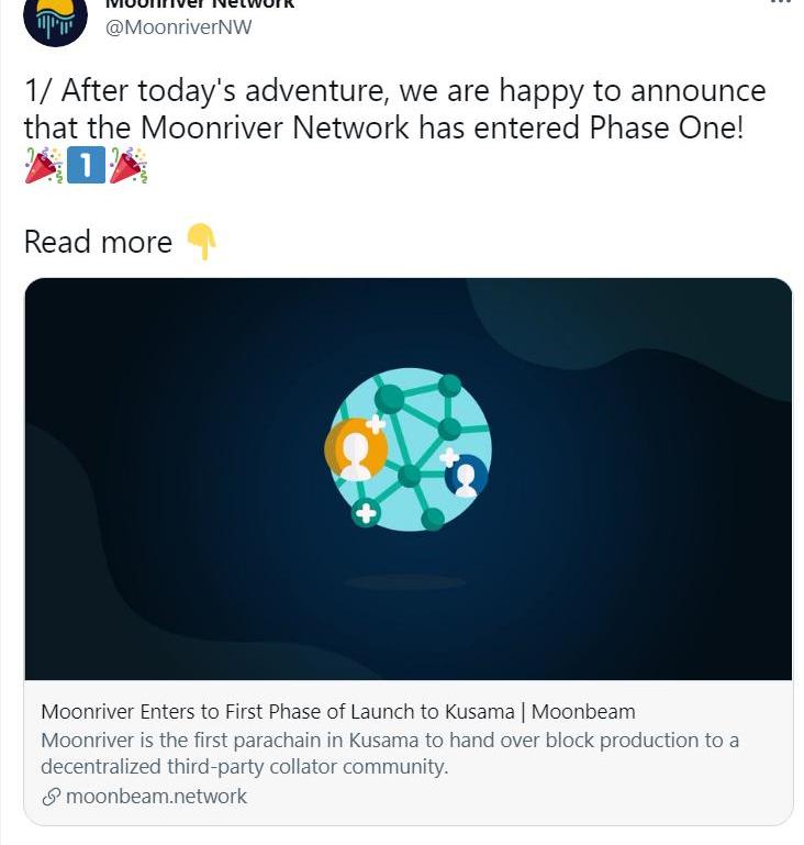 XRP/HKD-2.41%巴比特訊,7月10日,Kusama平行鏈Moonriver發文宣布完成其五階段啟動過程的初始步驟—第0階段技術準備,現已升級至第一階段部署期。據悉,Moonriver完成第一階段的部署工作約需1-2周,此階段將開放更多去中心化功能,如添加收集人節點等。