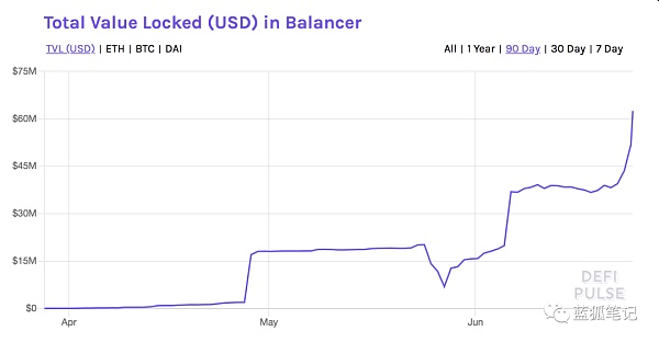 在三個星期之前的6月初,BAL推出了流動性提供商的挖礦計劃,其流動性出現第一次大的爬升,具體見下圖。第二次大的爬升是今天,上漲了41.6%,預計未來幾天還會有增長。就流動性而言,Balancer已經基本上跟Uniswap持平,Uniswap當前的流動性為6300多萬美元。