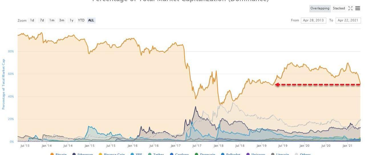 比特幣在市場的占有率是51.6%,當跌破50%的時候,魔法就開始了。