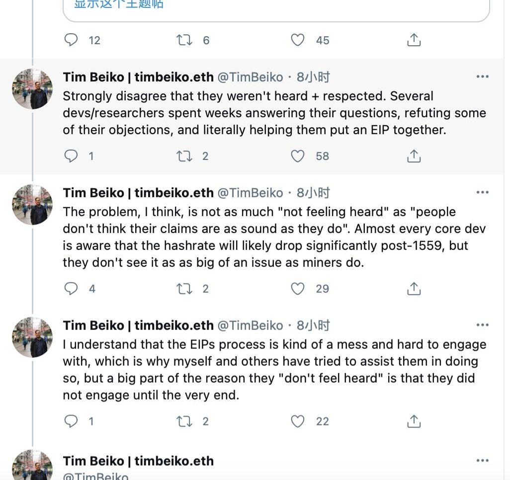 XRP/HKD+0.34%針對推特網友表示,礦工是以太坊的利益相關者,并且沒有得到足夠的重視。盡管EIP1559直接影響到了他們,但他們的意見并沒有得到尊重。如果礦工覺得自己被聽到了,就不會計劃發起51小時算力轉移示威活動以反對EIP-1559。以太坊開發者TimBeiko回復表示,強烈反對礦工沒有被傾聽和尊重。一些開發人員/研究人員花了數周時間回答他們的問題,駁斥他們的一些反對意見,并幫助他們建立一個EIP。幾乎每個核心開發人員都意識到,EIP-1559之后,哈希率可能會大幅下降,但他們并不像礦工那樣認為是大問題。礦工“感覺不被聽到”的很大一部分原因是他們直到最后才參與。礦工們參與的最佳時機應該是1年前,當時1559正處于非常活躍的開發階段。對于礦工的任何一項提議,就其性質而言,都將是有爭議的,我很難看到在倫敦硬分叉之前評估人們的情緒。