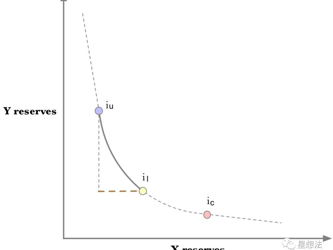 因為當前價格遠低于il,即使從當前價格向iu滑動,也只需要x的資金,不需要y的資金。所以,在這種情況下,delta_Y=0。因為從il滑向iu需要整個區間的x的資金,對于delta_X來說,價格變化為1/sqrt(il)-1/sqrt(p(iu))。
