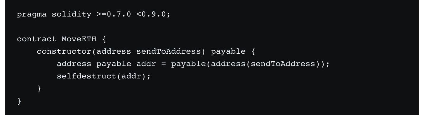 通過部署這個合約,我們可以在構造函數參數中發送ETH以及遭泄露的地址字符串。該合約通過在同一交易中創建合約并自毀來工作。使用selfdestruct意味著我們清除了區塊鏈狀態,并且在一次交易中將ETH轉發到了泄露地址。