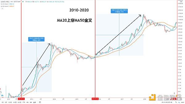 上圖是BTC2010-2020長期周線走勢,圖中兩條關鍵均線是周線MA20和MA50均線,研究可以發現,每次MA20均線上穿MA50均線形成金叉之后,后面BTC都能啟動一波強勢上漲趨勢行情。例如,第一次2012年7月,周線MA20上穿MA50均線金叉向上,后面BTC便開啟了12年的慢牛和13年的瘋牛行情,價格從8美金一路拉升至13年牛市頂點1150美金,歷時490天區間漲幅144倍。第二次便是15年的10月,MA20金叉MA50均線,后面BTC也是步入了16年的慢牛和17年大牛行情,幣價從300美金強勢拉漲至17年牛市頂點接近2萬美金,歷時777天區間漲幅64倍。第三次是19年6月,兩線金叉,價格從8000美金啟動,一路漲至19年小牛頂點14000美金再回落,歷時20天區間漲幅75%,這一次金叉屬于BTC19年趨勢行情的上漲中繼整理階段,蓄勢后價格進一步上行突破。