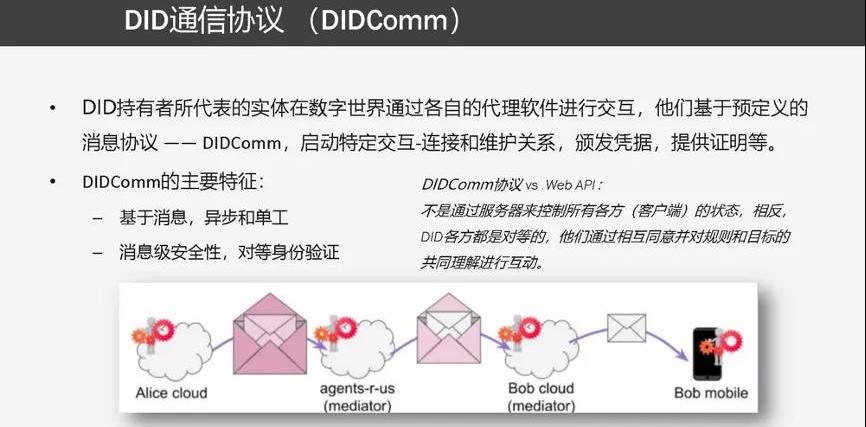 分布式身份第三個維度是分布式通信協議,這個通信協議的2.0版本規范正在由DIF組織起草。DIDCommunication協議與傳統的WebAPI的主要不同在于,不是通過服務器來控制所有各方的交互狀態。相反,DID各方都是對等的,他們通過彼此對規則和目標的共同理解以及共識來進行互動。