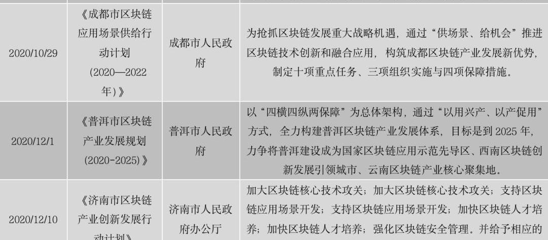 此外,截至2020年12月31日,共有20個省市將將區塊鏈寫入地方十四五規劃。相較年初政府工作報告,區塊鏈在十四五規劃中相關表述更加清晰,也反映出區塊鏈在各省市發展戰略中地位顯著提升。