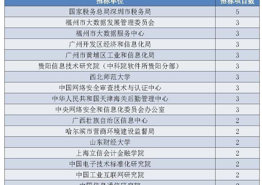 從具體單位來看,包括中央網絡安全和信息化委員會辦公室、自然資源部信息中心、全國海關信息中心在內的各級信息化部門是重要的招標主體,共發布了22個招標項目,占到了全部項目的19.5%,國家稅務總局深圳市稅務局、福州市大數據發展管理委員會、廣州開發區經濟和信息化局等17個單位都發布了不止一個招標項目;中國信息通信研究院等11家單位都獲得了不止一個項目的中標,其中9家都是企業,6家為小微企業。