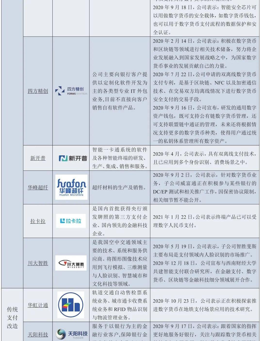 4、根據不完全統計,2019年至今,至少54家上市企業都在互動易、上證易等互動平臺公開表達了參與的意向或公布了相關研究的進展,這些企業以軟件和信息服務、電子設備制造類企業為主,業務領域可大致分為監管技術、安全技術、銀行科技、錢包與支付技術、傳統設備改造和對接支付場景六種。