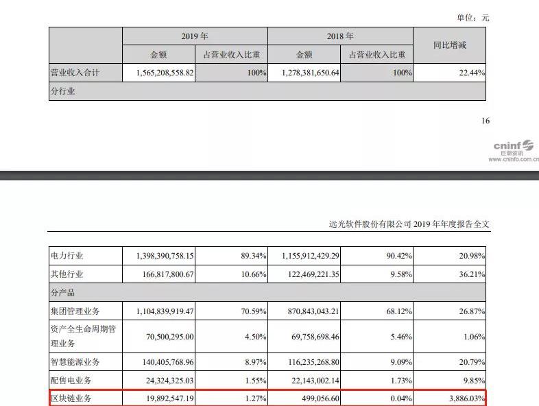 在深證區塊鏈50樣本股當中,遠光軟件曾展現了區塊鏈業務亮眼的一面。2019年年報顯示其區塊鏈業務實現營收1989.25萬元,同比增長3886.03%。