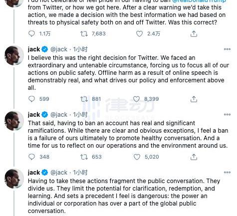 「我相信這是推特的正確決定。我們面臨著一種異常和不穩定的情況,迫使我們將所有行動都集中在公共安全上。在線言論所造成的離線危害是真實存在的,而這首先驅使我們的政策和執行。」不過Dorsey也反思到,「話雖這么說,但是禁止帳戶具有真正的重大影響。盡管有時候是面臨必要和明顯的例外情況,但我認為禁止賬戶是我們最終無法促進健康對話的一種失敗表現。這是我們反思自己的運營和周圍環境的時候了。」