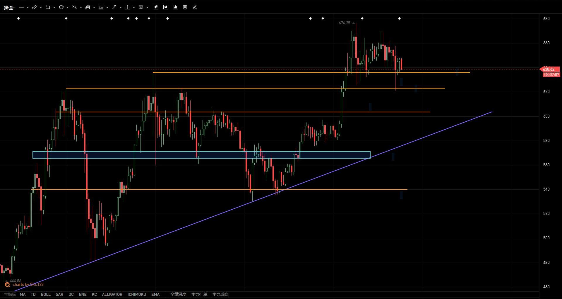 如圖所示,以太坊相對比特幣走勢較弱,上期投研報告所說636支撐已被測試多次,支撐效力逐漸降低;走向重點關注比特幣收斂結構突破方向,以太坊下方短期支撐位于620附近,重點關注600一線。