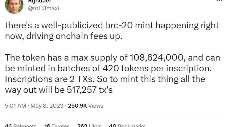 這種憑空鑄造大量代幣的能力是歇斯底里背后的原因——而且,對于區塊鏈的用戶來說,是焦慮。最近的區塊充滿了BRC-20交易,每筆交易的費用徘徊在20美元,比2022年大部分時間每筆交易1-2美元的典型費用高出800%。