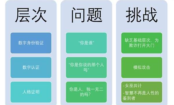對于數字身份,可以從三個層次去分辨:第一層,人格證明,確定個人的人性和獨特性;第二層,數字認證,確保只有合法身份驗證的人類才能執行某些行為操作,這一層解決的問題是,“你是你所說的那個人嗎?”,類似目前的基礎身份驗證;第三層數字身份驗證,重點回答“你是誰?”,這是最基礎的驗證層次,也是AI可以“渾水摸魚”的層次,也是風險最大的層次。