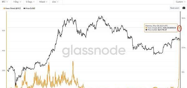據Glassnode數據顯示,比特幣5月8日礦工手續費達到635.35BTC,創出近4年來歷史記錄;從圖中可以直觀看到,比特幣在5月8日的手續費比上輪牛市頂點還要高。從具體數據看,截止5月8日10時,過去24小時共有141個區塊被8個礦工挖出,平均區塊手續費約為3.16枚BTC;而過去一年共有53,393個區塊被20個礦工挖出,平均區塊手續費約為0.15枚BTC,這意味著過去24小時平均區塊手續費較過去一年平均水平增加約21倍。