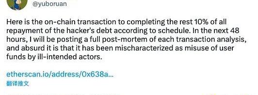 之所以沒有完全將BlockSec歸還的資金返還協議,是因為協議債務缺口為美元本位,而BlockSec返還的則是ETH,所以選擇了結合市場變化情況,以一、二周的頻率逐步賣出并補足協議債務缺口,該缺口最大時曾高達約570萬美元,現僅剩70萬美元左右,且還款計劃此前與團隊有過溝通。