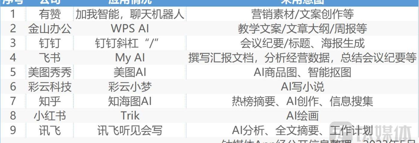 在上述落地場景中,這些先行試用的企業大多使用GPT進行AI創作、素材/圖片生成優化等方面的工作,為了避免方向的局限性,關于還有哪些領域最先將GPT引入業務流,鈦媒體App也詢問了ChatGPT,并讓其繪制成了表格。