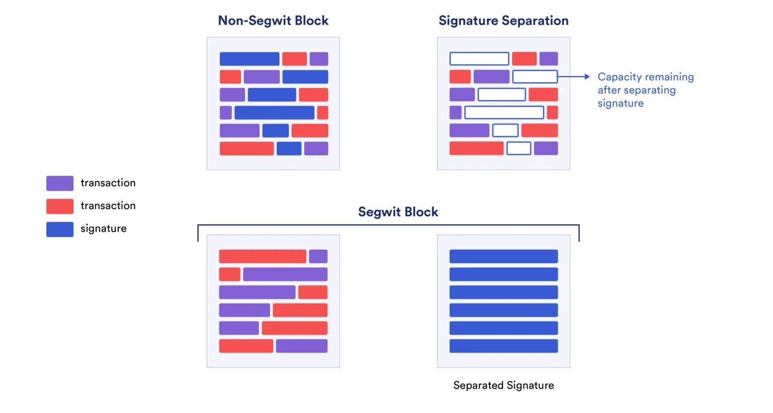 在技術意義上,SegWit的實施意味著交易不再需要包含見證數據。相反,在塊的末尾為見證數據創建了一個額外的空間,使其作為一個單獨的結構。它支持任意數據傳輸,并且讓“區塊權重”變小,巧妙地將大量數據保持在比特幣的塊大小限制內,以避免硬分叉。