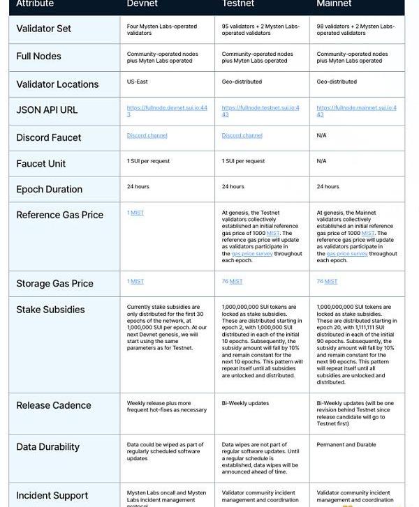 這里您可以看到SuiNetwork開發網、測試網、主網的性能以及功能的區別,其中主網上共有98個驗證節點和兩個由MystenLabs運行的節點。
