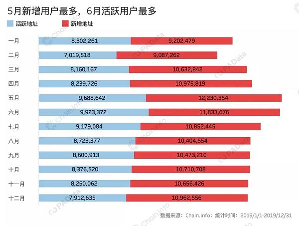 根據統計,2019年比特幣鏈上地址數總體呈溫和上升趨勢,全年增長24.72%。第二季度鏈上地址數突破了6200萬,包括活躍地址(指當天發生交易行為的地址,但不包含第一次交易的地址)3503.98萬個和新增地址(第一次發生交易行為的地址)2785.14萬個,是全年用戶最活躍的時期,同期比特幣的幣價正處于快速攀升階段。