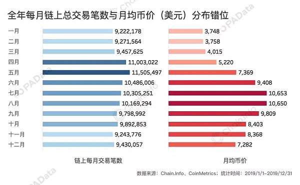 結合全年每月幣價的走勢可以發現,每月鏈上累計交易筆數與月均幣價的分布是錯位的,鏈上交易筆數最多是4、5、6月,而月均幣價最高的卻是6、7、8月。也就是說,鏈上交易頻次先于幣價啟動,而幣價高低基本不影響鏈上交易頻次。