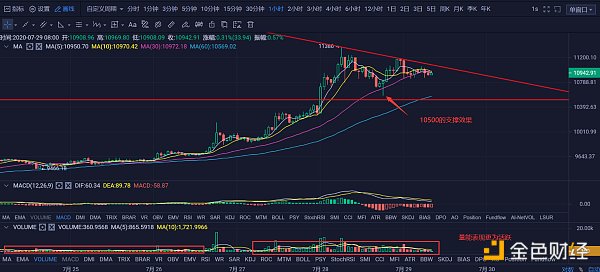XRP/HKD+0.68%昨晚行情回撤至10570后反彈,和我們預想的可能測試10500美元支撐的位置差不多,現在這個區間走一下還是很有必要的,日線級別的斜率拉的太高并不是什么好事,就跟前段時間的周線一樣,短時間內斜率拉的太高后期面對的就是長時間的震蕩或者暴漲暴跌來消化行情,K線漲的太高還是有必要等等均線粘合,確認有效支撐后再繼續上行。