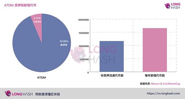 截至 2020 年 6 月 18 日,ATOM 的總市值為 511415238 美元,也就是說非質押流通市值只有 31298612 美元,這個數量和在 Coinmarketcap 排名第 137 名的 Dragoncoin 接近。目前總流通代幣數(Circulating Supply)為 190688439 個,按照現在的質押率和年化收益率計算得出每年增發的數量為 16577095.185 顆。也就是說每年 ATOM 增發的代幣是現有的非質押流通代幣 1.42 倍。