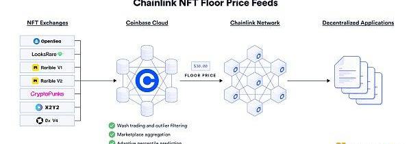 為了解決這些挑戰,行業標準之一,ChainlinkNFTFloorPriceFeeds,將去中心化預言機網絡固有的安全性和可靠性與CoinbaseCloud的世界級定價方法相結合,向開發人員提供高質量、安全、穩定和準確度極高的NFT底價數據。以下是該Feed如何工作: