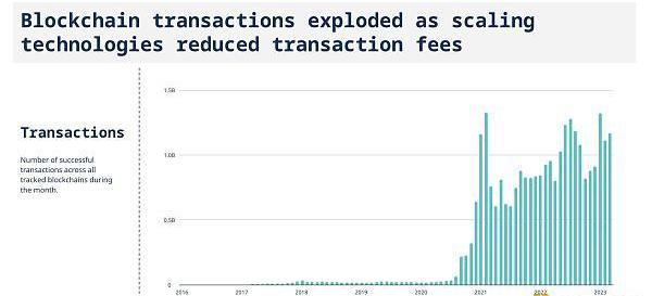 更好的工具和擴展技術也吸引了更多低gas費的交易。值得注意的是,過去兩年中,區塊鏈交易總數增長了超過50%。